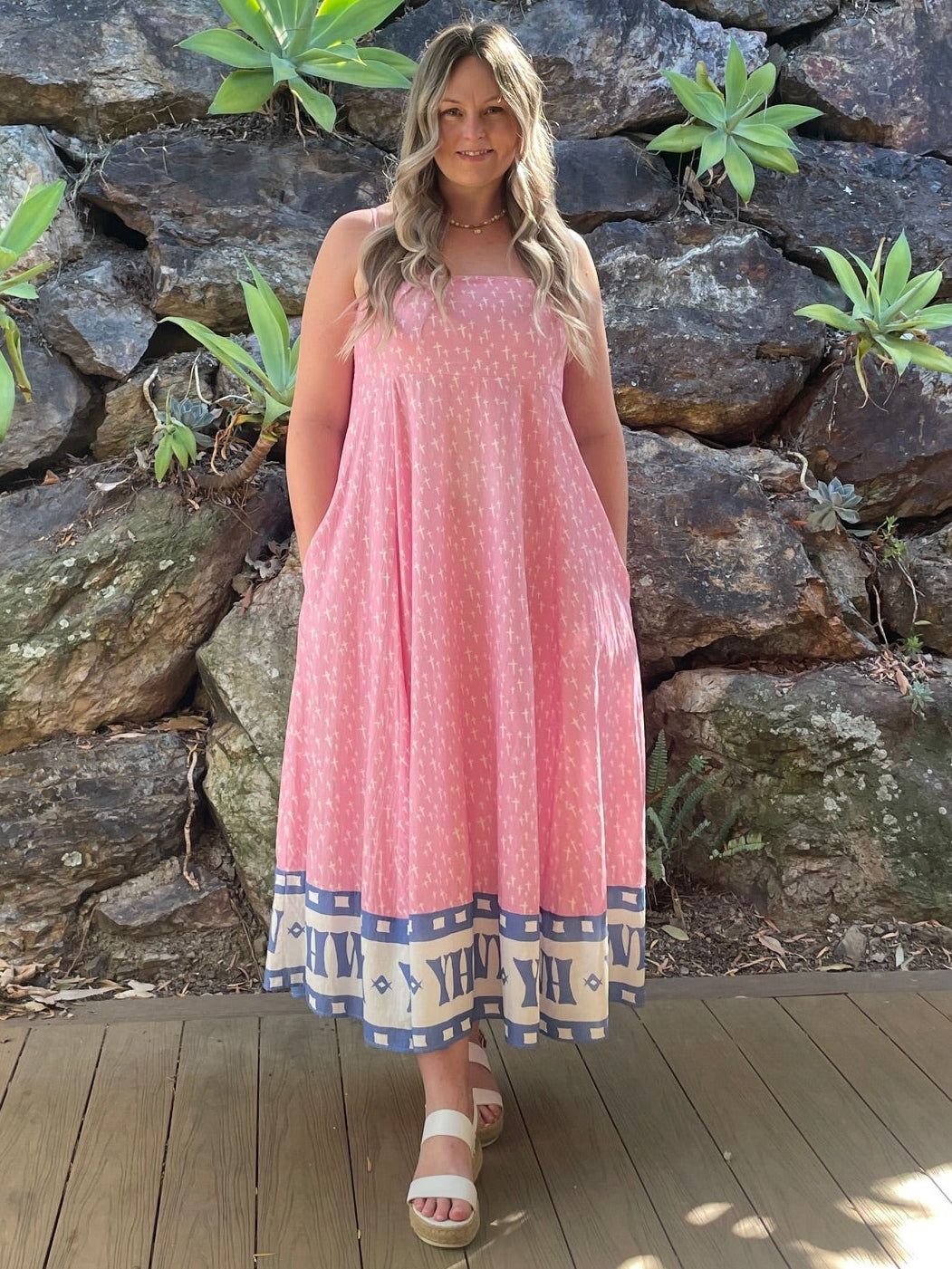 The "I Am" Christian Dress is a full-length, fully lined garment crafted from pure 100% cotton, designed with spiritual intention and practical comfort in mind. Its adjustable straps and elastic back provide a secure, adaptable fit, while the generous skirt section accommodates various body types and stages, including early pregnancy. This dress also has pockets! A new innovation in Christian clothing.